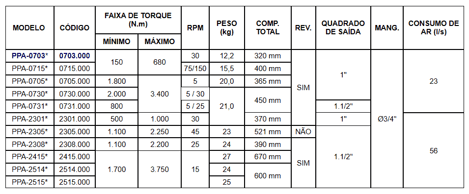 Industrial application stall-type torque wrenches with torque range from 150 to 680 N·m. Designed for high performance, long durability, and easy maintenance, with an authorized technical support network available throughout the country. Stall-type torque control (adjusted via air supply), compatible with reaction bars or custom fixtures tailored to each application. Available in reversible or non-reversible models, developed according to the customer’s specific requirements.