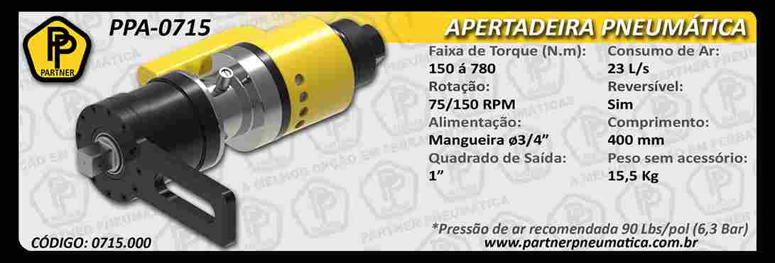 Apertadeiras de aplicação industrial, auto rendimento, grande durabilidade, fácil manutenção, rede de assistência técnica autorizada em todo território nacional. Tipo Stall torque (regulagem pela alimentação de ar), pode utilizar barra de reação ou fixação adequada a cada tipo de aplicação, modelos reversíveis ou não, podendo ser desenvolvida conforme necessidade do Cliente.