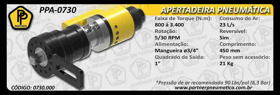 Apertadeiras de aplicação industrial, auto rendimento, grande durabilidade, fácil manutenção, rede de assistência técnica autorizada em todo território nacional. Tipo Stall torque (regulagem pela alimentação de ar), pode utilizar barra de reação ou fixação adequada a cada tipo de aplicação, modelos reversíveis ou não, podendo ser desenvolvida conforme necessidade do Cliente.