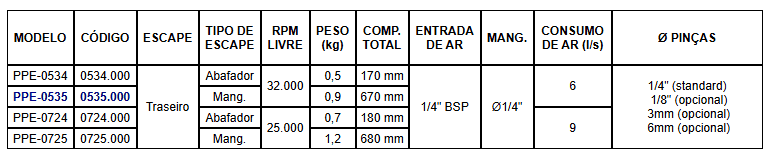 Esmerilhadeiras de ferramentaria, escapamento trazeiro dirigido ou embutido, polimento e rebarbação de moldes ou estampos em geral. De aplicação industrial, auto rendimento, grande durabilidade, fácil manutenção, rede de assistência técnica autorizada no território nacional.