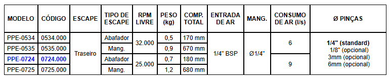 Esmerilhadeiras de ferramentaria, escapamento trazeiro dirigido ou embutido, polimento e rebarbação de moldes ou estampos em geral. De aplicação industrial, auto rendimento, grande durabilidade, fácil manutenção